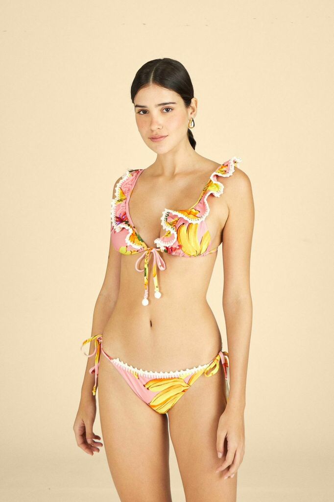 Biquini com lacinhos de amarração nas laterais inferior e amarração frontal na parte superior, acabamento em bordado e babados trazendo charme delicado a area do busto. Estampa exclusiva farm