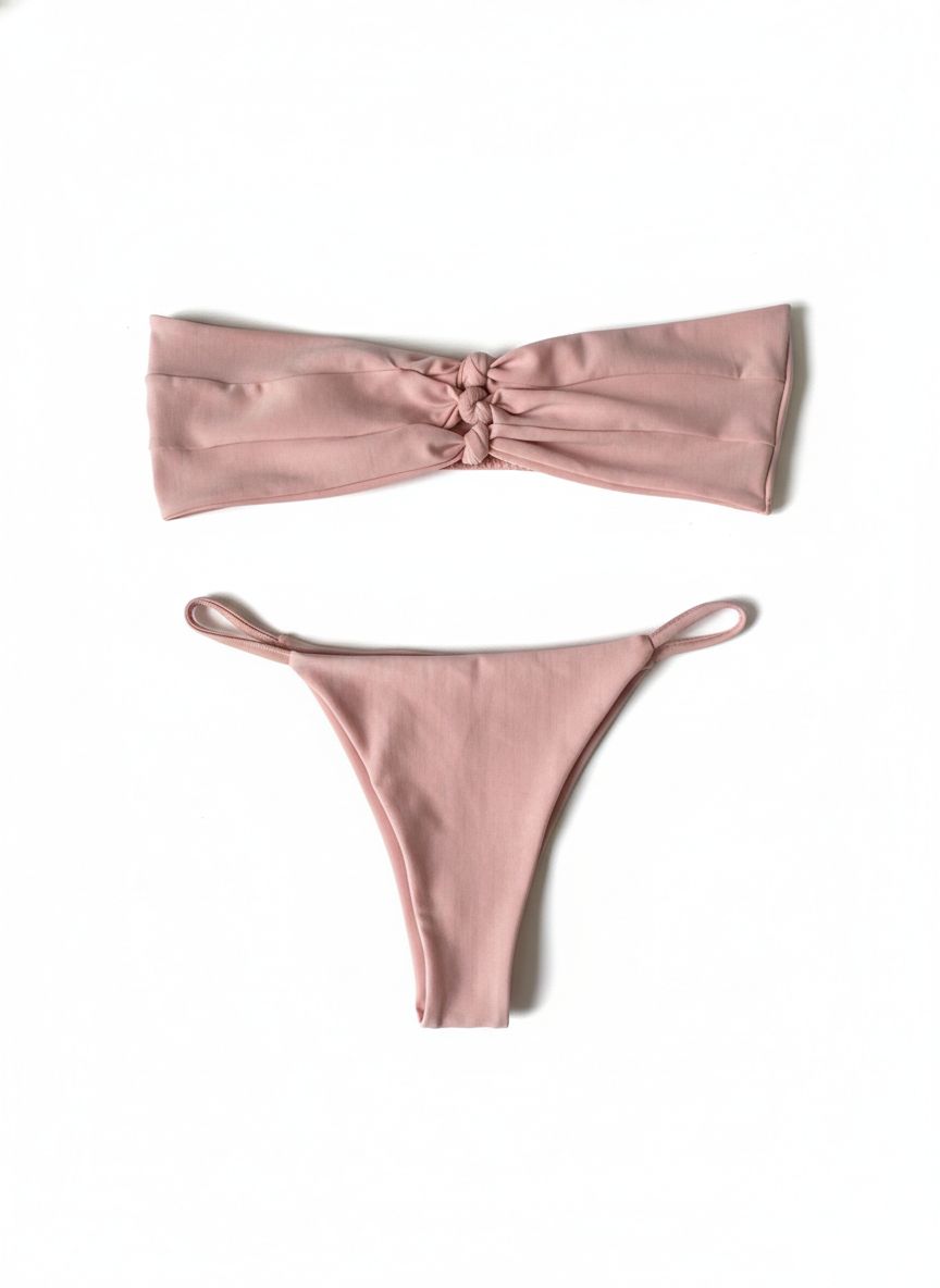 Top: Modelo tomara que caia estilo faixa. O diferencial está no centro, com três detalhes de nós que criam aberturas vazadas (cut-outs), conferindo um toque artesanal e sofisticado à peça.