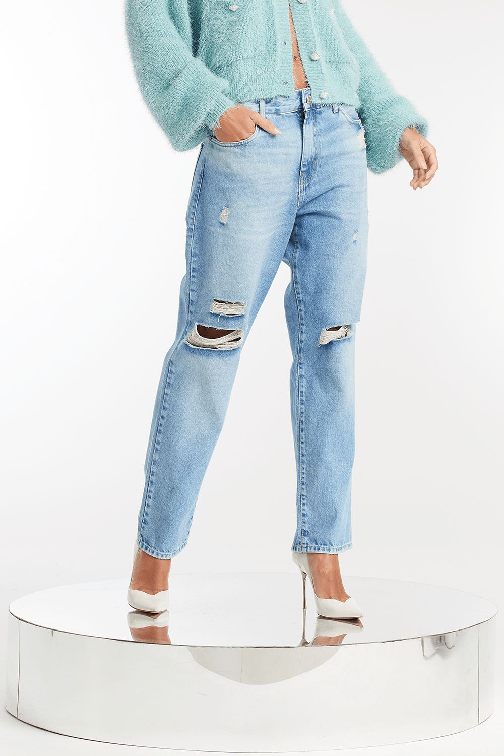 Calça jeans clara, detalhes desfiados na altura dos joelhos, caimento reto e moderno, cintura media acabamento PREMIUM