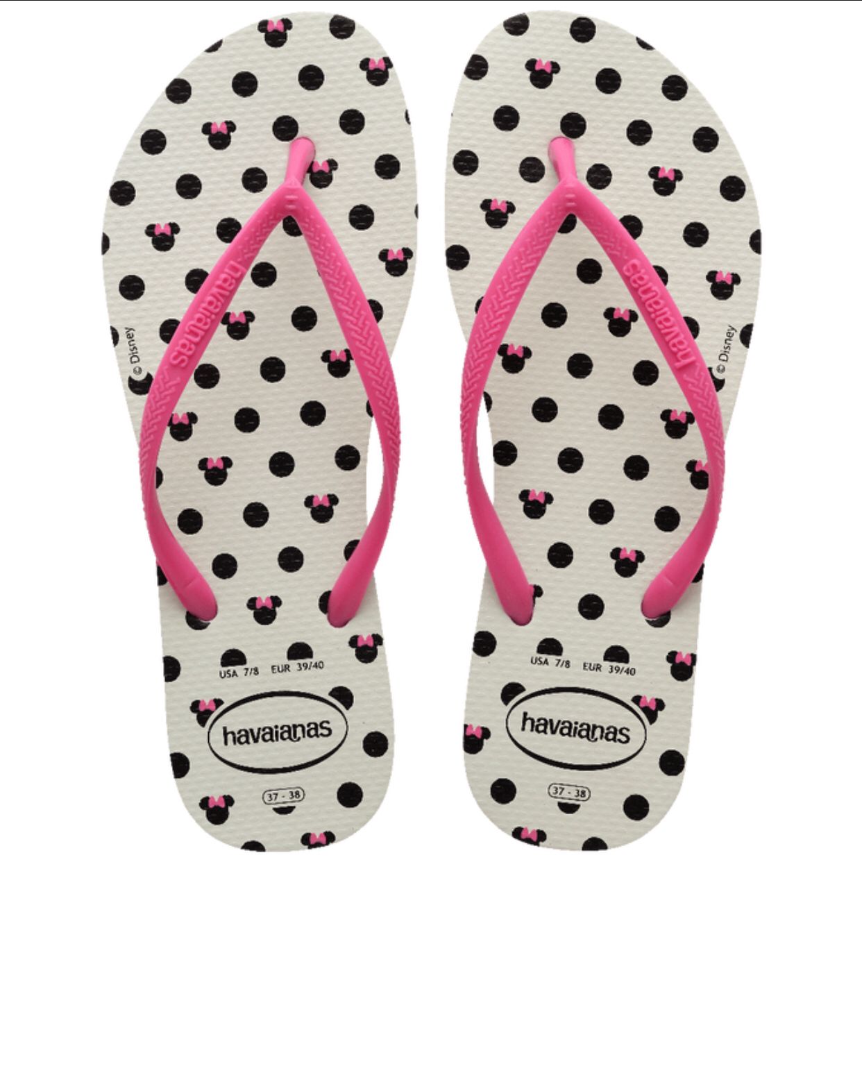 As bolinhas que Minnie Mouse tanto ama dão o clima retrô destas Havaianas, enquanto a paleta de cores traz a moda diretamente para a modernidade. Disponíveis em amarelo e rosa.