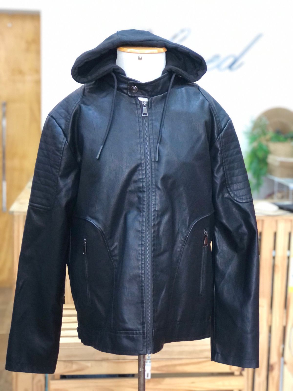 Jaquetas masculina de inverno confeccionada em PU ( couro ecologico). Possui bolso frontal com detalhe de fechamento em zíper , capuz destacável acolchoado forrado de algodão.