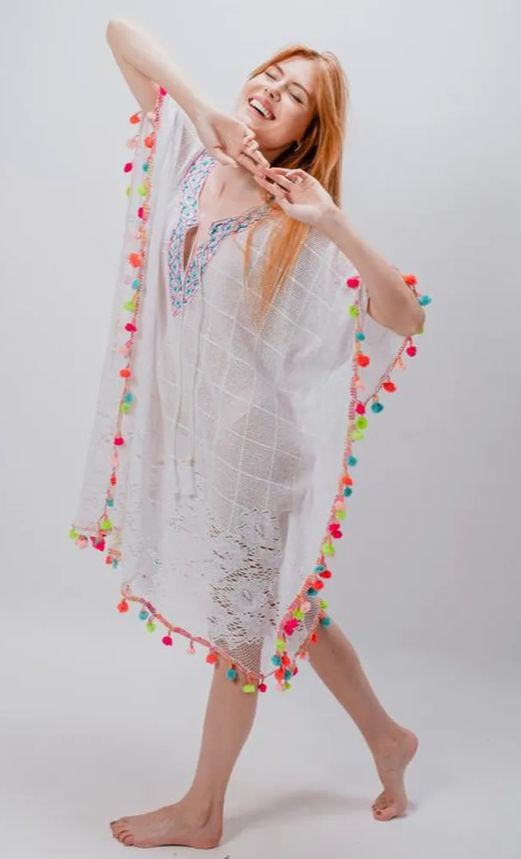 Saída de praia indiana em algodão, com pompons coloridos na barra da peça, gola V bordada a mão.