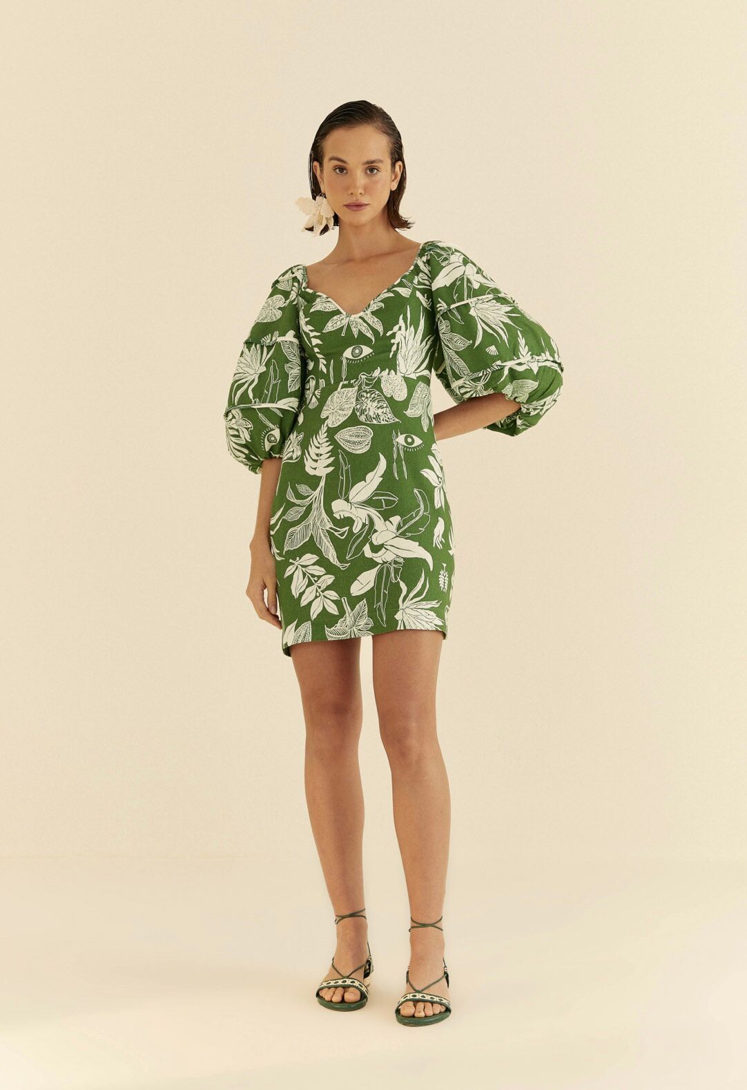 O vestido verde é confeccionado em tecido leve. A peça possui decote coração, mangas bufantes 3/4 com recortes, recortes frontais, recorte posterior, lastex aplicado na região lastex, estampa de folhagem em cor contrastante, shape solto e comprimento curto.